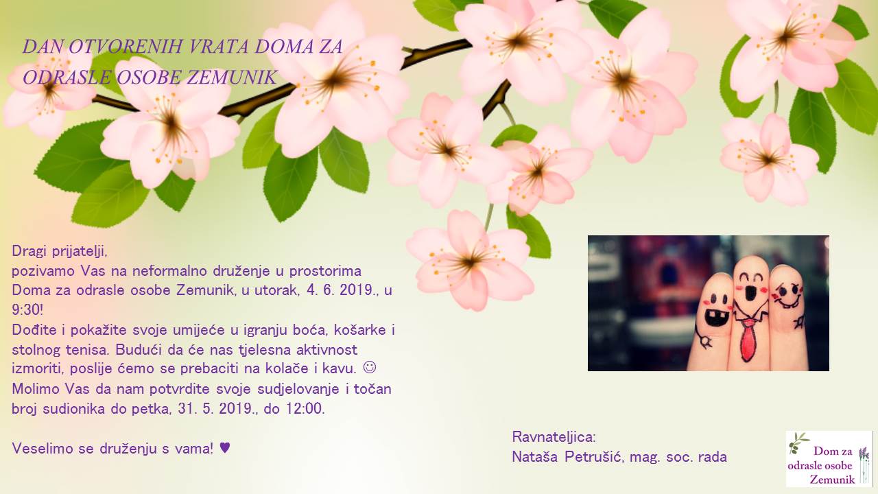 pozivamo Vas na neformalno druženje u prostorima Doma za odrasle osobe Zemunik, u utorak, 4. 6. 2019., u 9:30!